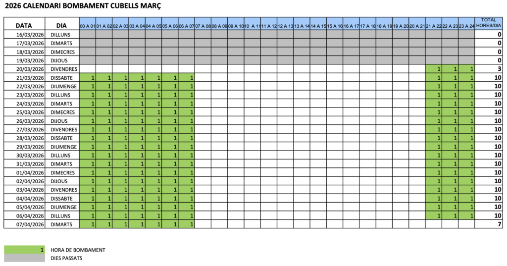 Iniciarem el bombament de Cubells avui divendres de 21 h a 7h del dia següent (10 h/dia). Farem aquest horari fins dilluns 06/04 (passat Setmana Santa). A partir d’alli s’haurà de fer petició de nou.